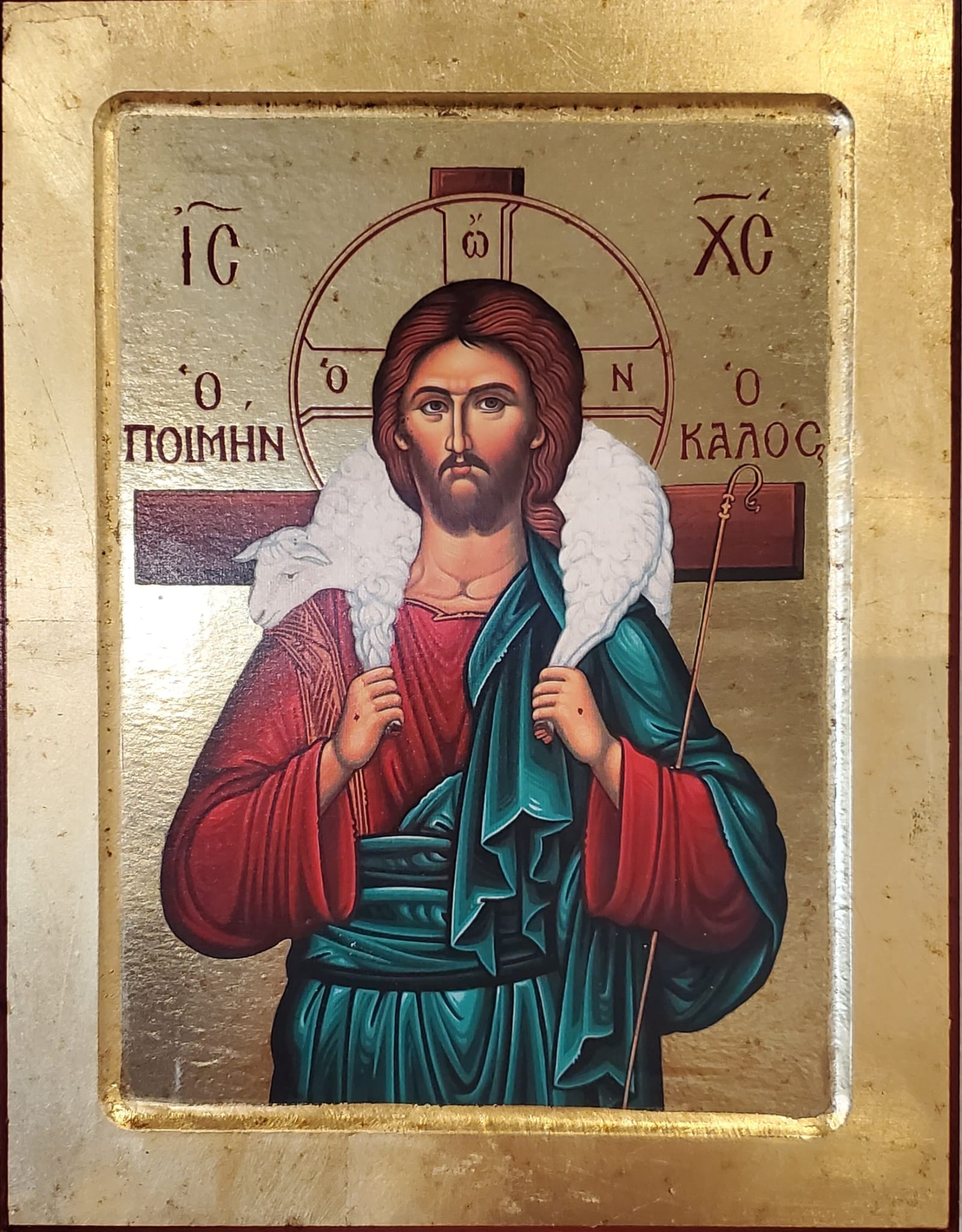 Handwritten icon created on wood panel with rabbit skin glue, fabric and gesso. Icon is written in prayer using only the highest quality products (woods, paints, etc.) and 24 carat gold leaf.